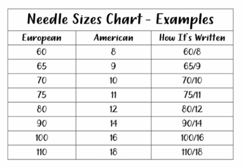 The next chart shows that the European size and the American size are not the same number, but they are typically combined on your needle package. (source: SEWINGMACHINEFUN.COM)